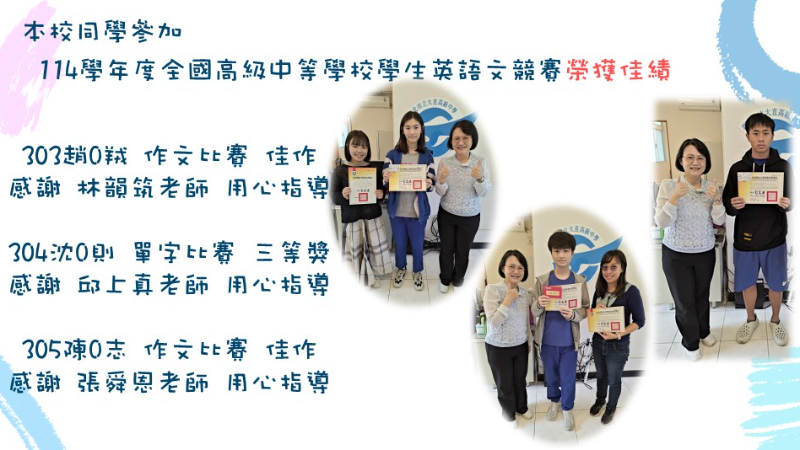 | 2026-02-26 | 狂賀本校同學參加114學年度全國高級中等學校學生英語文競賽榮獲佳績 | 最新消息 | 高中部教學組 | 61 |