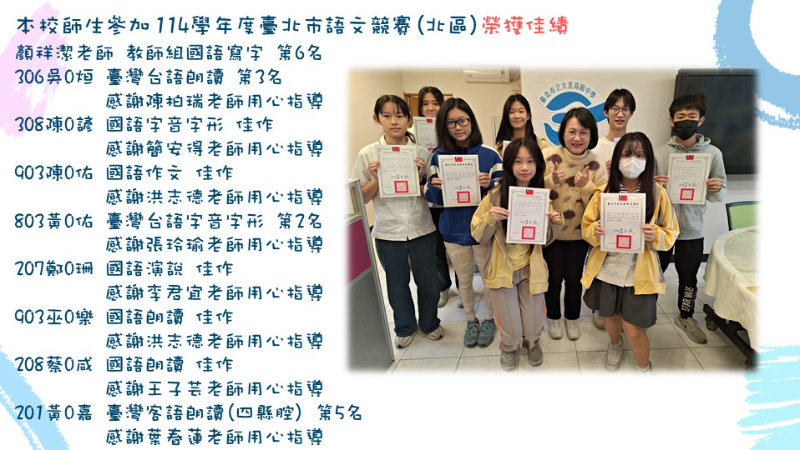 | 2026-02-26 | 狂賀本校師生參加 114學年度臺北市語文競賽(北區)榮獲佳績 | 最新消息 | 高中部教學組 | 62 |