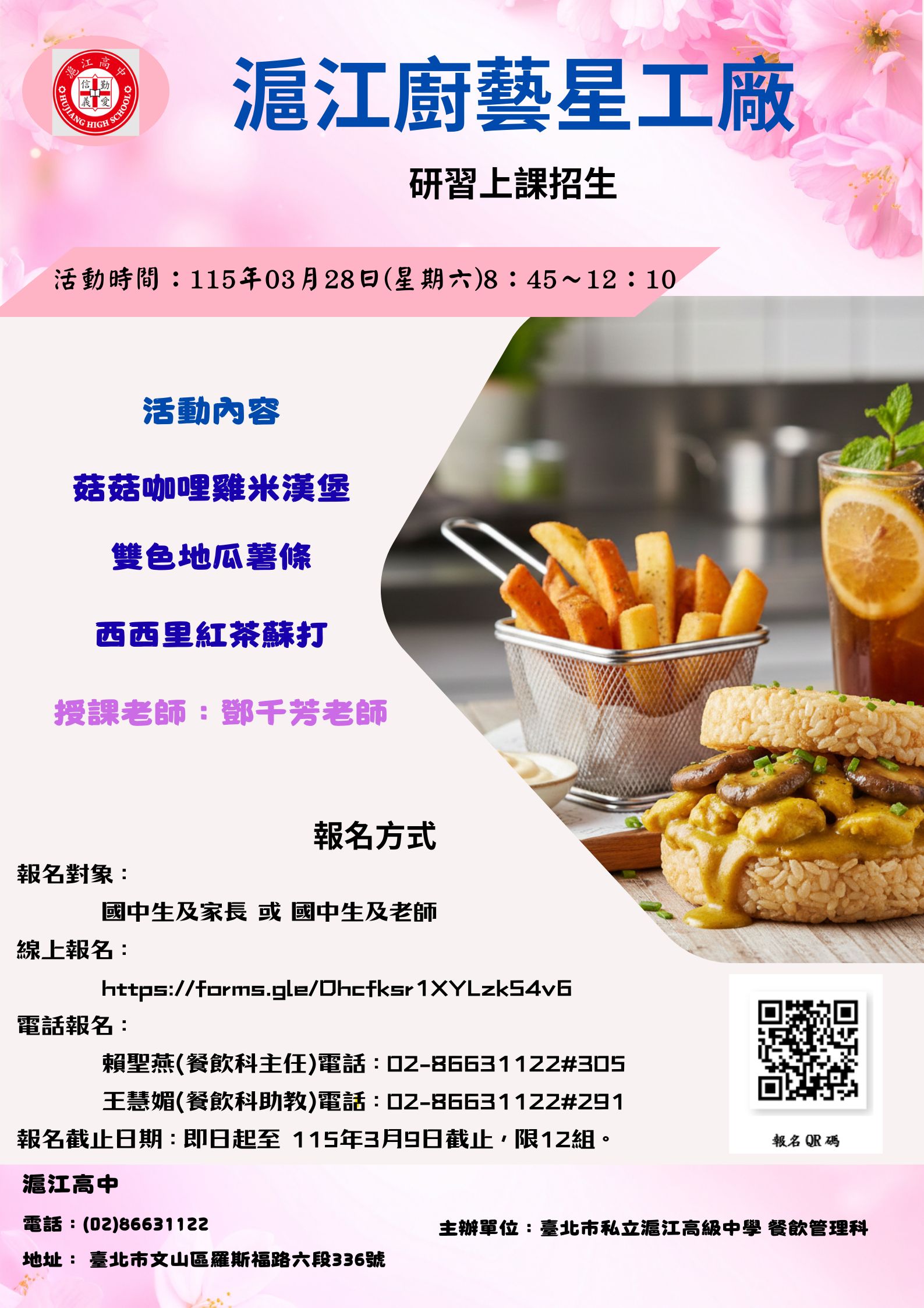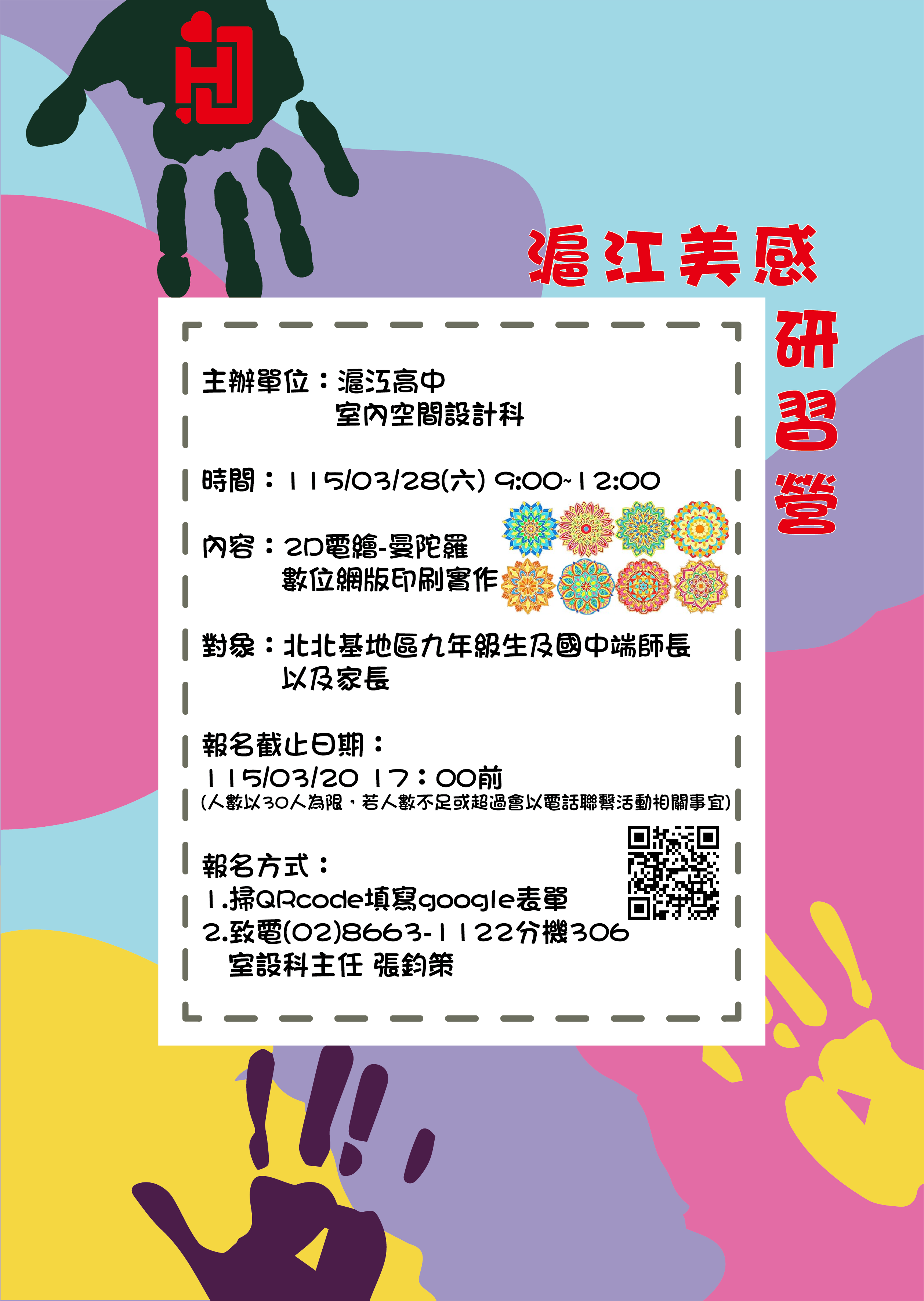 一、為協助國中學生探索設計職群發展,本校室內空間設計科規劃**「2D電繪曼陀羅」**體驗課程,運用AdobeIllustrator軟體引導學生從基礎「點、線、面」出發,創作療癒系曼陀羅圖騰,體驗數位設計之美。 二、活動當日適逢本校櫻花祭,校園內備有多項精彩活動,誠邀貴校親師生共同參與:【專業體驗】包含室內空間設計科電繪課程、餐飲管理科「廚藝星工廠」實作。【熱血競技】辦理「滬怕WHO」水彈賽,提供安全刺激的動態對抗體驗。【美感生活】設置櫻花樹下二手市場尋寶區及野餐區,感受浪漫校園氛圍。 三、活動資訊:時間:115年3月28日(星期六)09:00–12:00。地點:臺北市私立滬江高中(臺北市文山區羅斯福路六段142巷1號)。報名:請掃描海報QRCode或連結Google表單https://forms.gle/CuEidLNZm9J3rFoB6報名。 |