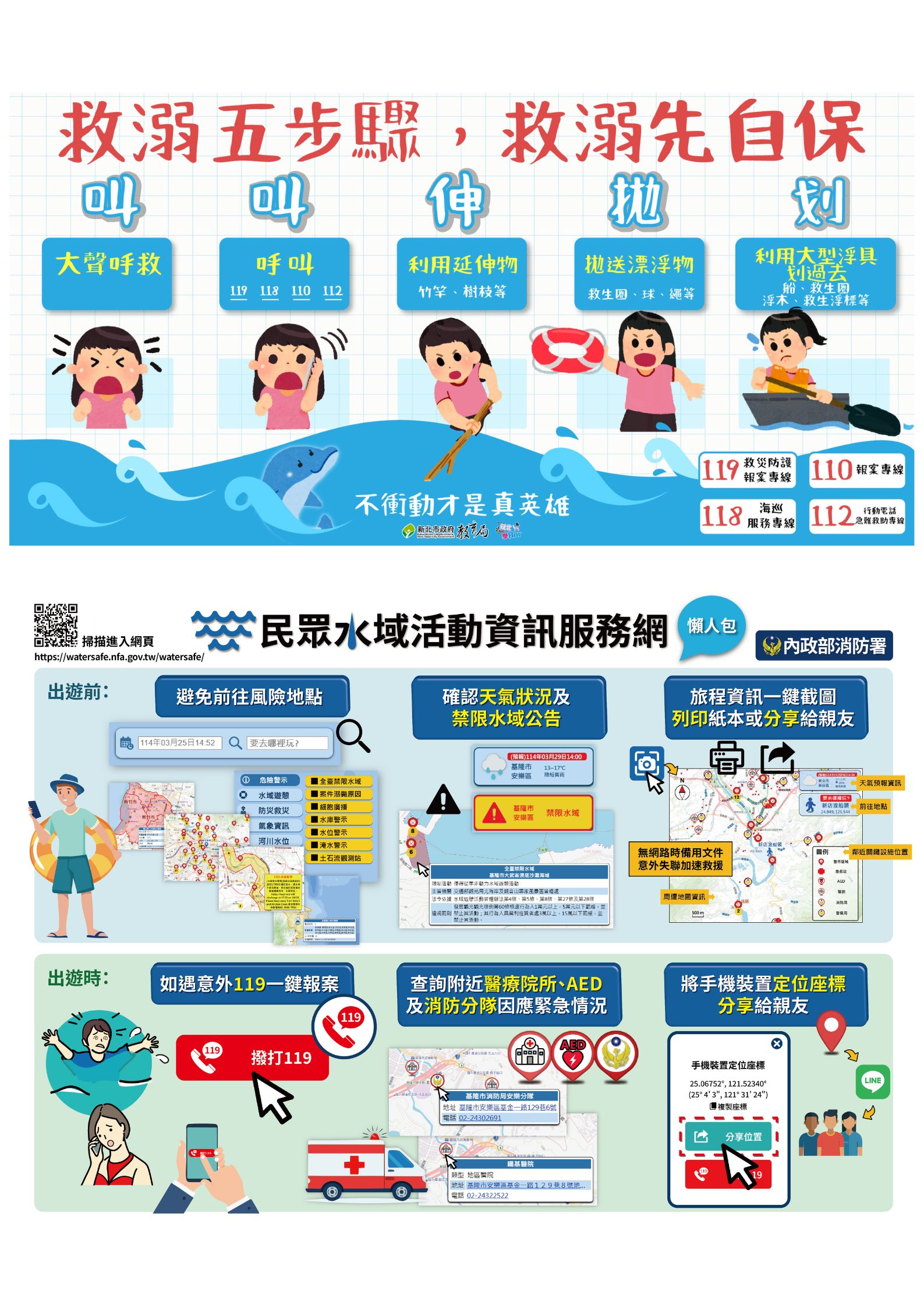 一、依據教育部校園安全暨災害防救通報,學生溺水死亡發生地點皆為無救生設備與人員之場所,且發生時間集中在放假期間。 二、近日偶有大雨情形,考量於假期間,參與露營或健行等各式活動規劃戲水、涉溪情形,或者從事水域遊憩(含游泳、衝浪、潛水、獨木舟等)等活動可能性高,請務必落實水域及遊憩安全,且應穿著救生衣並選擇合法水域場所、前往有合格救生員駐守之安全水域地點戲水,強化水域安全觀念,避免溺水事件發生。 三、另近日參與民間業者辦理營隊偶有爭議,提醒選擇合法營隊,並於參加校外營隊活動期間,注意水域活動安全,檢視實際活動內容是否與口頭或書面契約約定相符,並要求營隊活動主辦單位說明安全防護與緊急救護規劃及措施,若於參加校外營隊活動期間發生疾病或事故,或與業者發生履約糾紛時,得主動尋求學校協助。 四、水域安全宣導相關資訊(網址:https://drive.google.com/drive/folders/1S0w5Pu40IanIsqydLnu9ZFMbkaa7wSi6),說明如下: (一)水域安全教育宣導文宣5份。 (二)新北市政府消防局公告「新北市危險水域一覽表」1份。 (三)中華民國海洋委員會公告「我國目前禁止或限制水域遊憩活動海域範圍」1份,請依據相關法令勿於公告禁止之水域從事水域遊憩活動,避免違規與罰則。 (四)教育部發佈「選擇安全地點,露營戲水有保障」資訊1份。 (五)教育部國民及學前教育署頒佈「高級中等以下學校辦理學生課外活動及輔導學生參加校外營隊活動注意事項」。 (六)內政部消防署發布113年消防機關執行水域事故救援統計分析及民眾水域活動資訊服務網懶人包資訊。 (七)基北北桃易發生危險之開放性水域名單。 五、有關各單位發佈水域安全宣導相關資訊: (一)「救溺特攻隊」、「決定命運4招」、「新版防溺10招」、「自救救人-溪河流篇」等水域安全宣導短片與「救溺5步、防溺10招」海報檔案,請至https://www.space.ntu.edu.tw/navigate/a/#/s/22A28B87C2BC4205AF7B43A1117174596BL下載。 (二)國教署針對不同學習階段的學生,所規劃設計之水中自救教學影片、e-learning等水域安全數位教材,已上架教育雲(https://cloud.edu.tw/webpages/category.php?id=cc84df85-f3e3-4aa9-946e2d77569baf2d&page=1&num=12),教材內容結合生活情境,期盼透過落實水域安全教育,強化正確的自救技能及水域安全知識觀念。 (三)消防署業透過優化既有系統,進一步將過往歷史案件的大數據統計分析結果加值應用,並於113年度完成建置「民眾水域活動資訊服務網頁」(網頁連結: https://watersafe.nfa.gov.tw/watersafe/)。 詳細資料請參考附件。 |