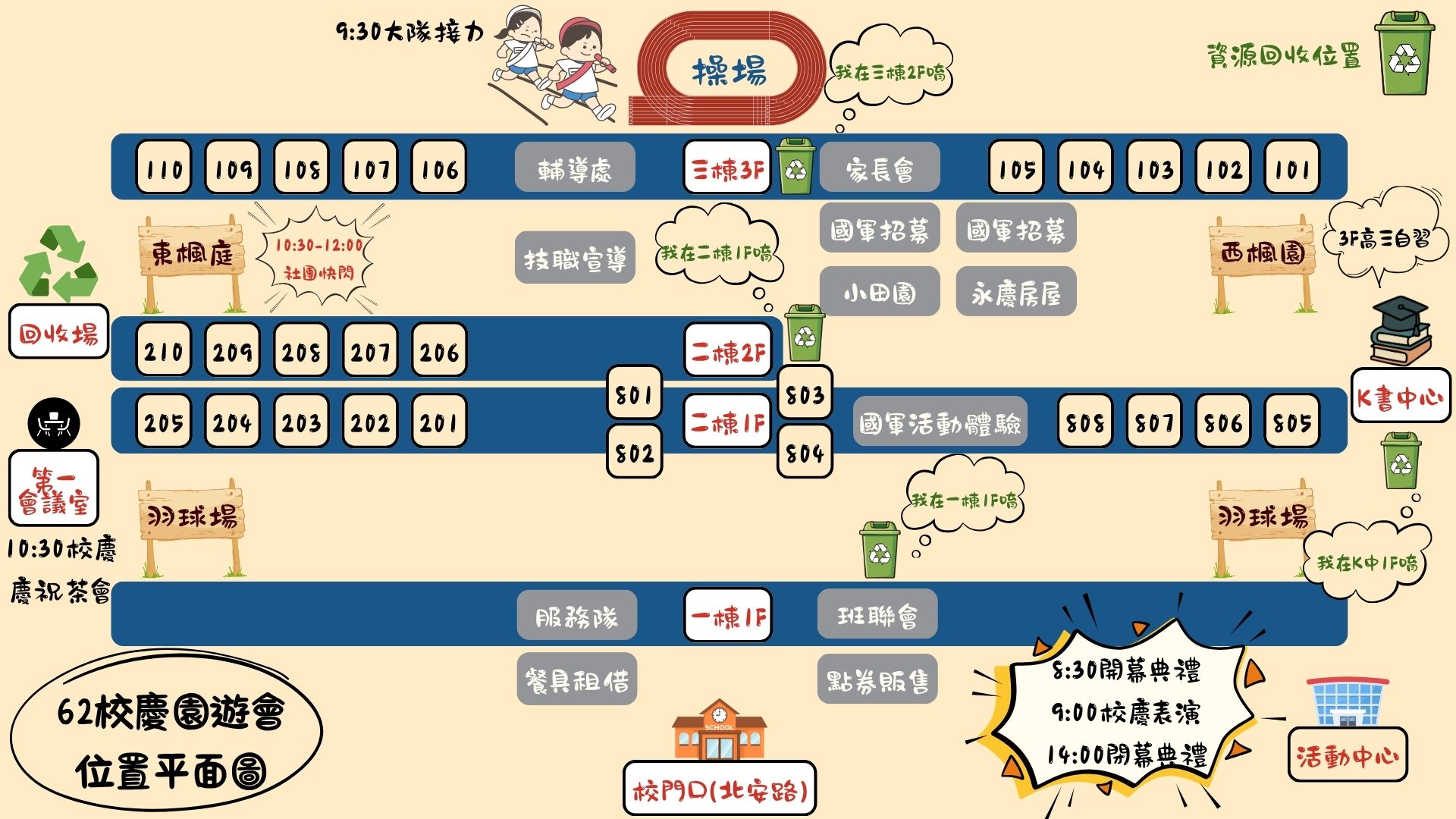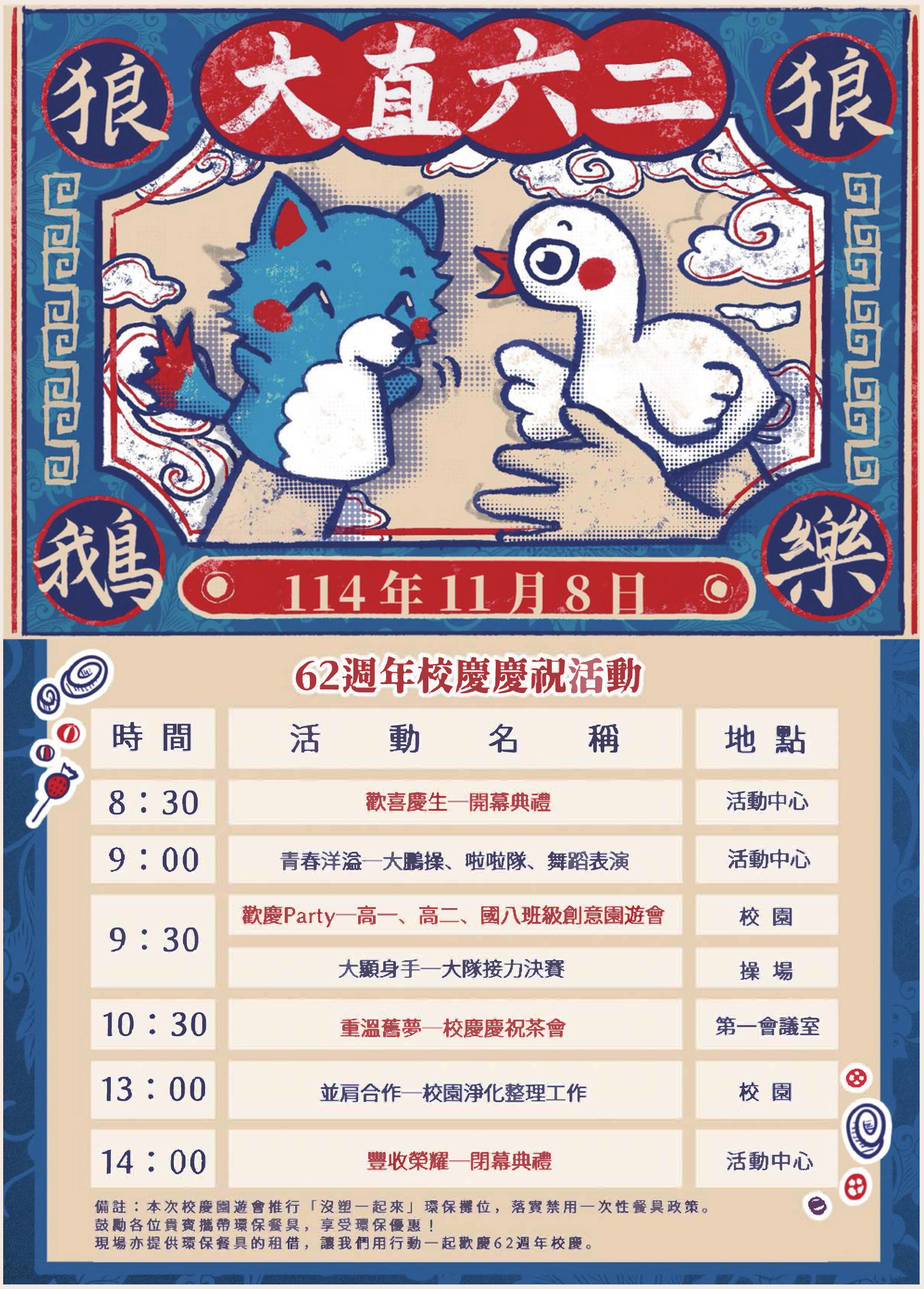 校園公告 公告主旨 大直六貳 狼狼鵝樂—62校慶 發佈日期 2025 年 11 月 07 日 發佈單位 訓育組 公告類別 最新消息, 學生與家長, 競賽與活動 公告等級 活動 點閱次數 129 公告內容 62校慶流程 62校慶 園遊會攤位設置平面圖 歡迎大家 沒塑一起來唷^^ 相關附件 62校慶 電子螢幕放映(一川) 62校慶 電子螢幕放映(一川) 檔案名稱檔案大小檔案格式下載62校慶 電子螢幕放映(一川).jpg1.91 MB新視窗開啟檔案62校慶 攤位設置平面圖(校內版).pdf1.02 MB新視窗開啟檔案 62校慶 電子螢幕放映(一川).jpg62校慶 攤位設置平面圖(校內版).pdf 【2025-11-07】轉知臺北市114學年度高級中等學校適應體育種子教師上學期培訓工 ...