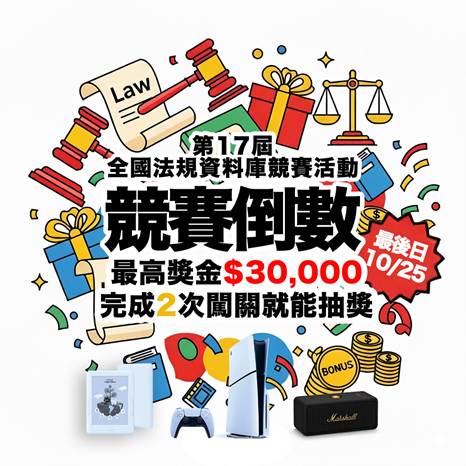 📢【第17屆全國法規資料庫競賽|最後倒數🔥】 🎯 透過線上闖關,輕鬆學法規、抽好禮~ 想拿 🎁 PS5、電子書、Marshall音響 還有 💰 最高獎金 30,000 元 嗎? 📚 競賽資訊 👉 小漫畫暖身:https://gemini.google.com/share/18b394803f5e 📣 各位同學,快揪同學一起挑戰吧~