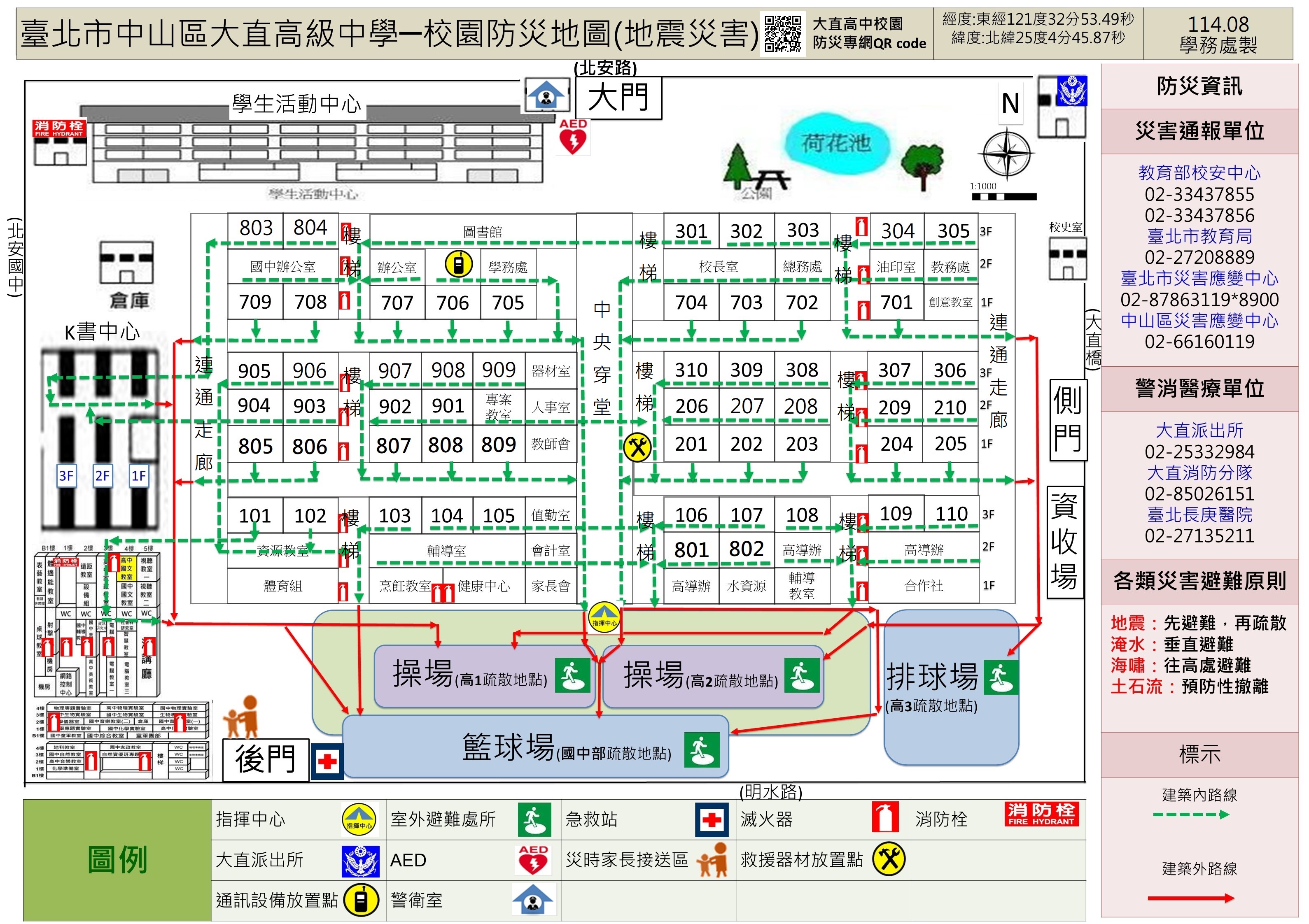 校園災害防救計畫 點擊圖檔下載相關檔案 附件 大直高中112年基礎建置類學校輔導訪視執行計畫 大直高中112年基礎建置類學校輔導訪視執行計畫 檔案名稱檔案大小檔案格式下載大直高中112年基礎建置類學校輔導訪視執行計畫.pdf1.07 MB新視窗開啟檔案 大直高中112年基礎建置類學校輔導訪視執行計畫.pdf 臺北市水庫潰壩避難疏散原則 臺北市水庫潰壩避難疏散原則 檔案名稱檔案大小檔案格式下載臺北市水庫潰壩避難疏散原則.docx139.51 KB新視窗開啟檔案臺北市水庫潰壩避難疏散原則.odt131.13 KB新視窗開啟檔案 臺北市水庫潰壩避難疏散原則.docx臺北市水庫潰壩避難疏散原則.odt 臺北市政府教育局所屬各級學校因應重大災害交通中斷學生返家困難處置原則 臺北市政府教育局所屬各級學校因應重大災害交通中斷學生返家困難處置原則 檔案名稱檔案大小檔案格式下載臺北市政府教育局所屬各級學校因應重大災害交通中斷學生返家困難處置原則.pdf78.33 KB新視窗開啟檔案 臺北市政府教育局所屬各級學校因應重大災害交通中斷學生返家困難處置原則.pdf 臺北市立大直高級中學113學年度防災教育實施計畫 臺北市立大直高級中學113學年度防災教育實施計畫 檔案名稱檔案大小檔案格式下載臺北市立大直高級中學 113 學年度防災教育實施計畫.pdf1.43 MB新視窗開啟檔案 臺北市立大直高級中學 113 學年度防災教育實施計畫.pdf 校園災害防救計畫書-附件 校園災害防救計畫書-附件 檔案名稱檔案大小檔案格式下載校園災害防救計畫書-附件.pdf10.37 MB新視窗開啟檔案 校園災害防救計畫書-附件.pdf 1130920 臺北市大直高中防災演練矩陣式腳本 1130920 臺北市大直高中防災演練矩陣式腳本 檔案名稱檔案大小檔案格式下載1130920臺北市大直高中防災演練矩陣式腳本.pdf1.57 MB新視窗開啟檔案 1130920臺北市大直高中防災演練矩陣式腳本.pdf 113-1演練檢討會議紀錄 113-1演練檢討會議紀錄 檔案名稱檔案大小檔案格式下載113-1演練檢討會議紀錄.pdf306.25 KB新視窗開啟檔案 113-1演練檢討會議紀錄.pdf 113-2演練檢討會議紀錄 113-2演練檢討會議紀錄 檔案名稱檔案大小檔案格式下載113-2演練檢討會議紀錄.pdf3.47 MB新視窗開啟檔案 113-2演練檢討會議紀錄.pdf 113學年度大直校園防災疏散路線圖 113學年度大直校園防災疏散路線圖 檔案名稱檔案大小檔案格式下載1130217大直高中-防災地圖85X120地圖.jpg497.46 KB新視窗開啟檔案1130510大直高中-防空地圖85X120地圖.jpg299.38 KB新視窗開啟檔案 1130217大直高中-防災地圖85X120地圖.jpg1130510大直高中-防空地圖85X120地圖.jpg 臺北市立大直高級中學114學年度防災教育實施計畫 臺北市立大直高級中學114學年度防災教育實施計畫 檔案名稱檔案大小檔案格式下載臺北市立大直高級中學114學年度防災教育實施計畫.pdf4.50 MB新視窗開啟檔案 臺北市立大直高級中學114學年度防災教育實施計畫.pdf 114學年大直校園防災疏散路線圖 114學年大直校園防災疏散路線圖 檔案名稱檔案大小檔案格式下載114學年大直校園防災疏散路線圖.jpg1.63 MB新視窗開啟檔案 114學年大直校園防災疏散路線圖.jpg 1140920臺北市大直高中防災演練矩陣式腳本 1140920臺北市大直高中防災演練矩陣式腳本 檔案名稱檔案大小檔案格式下載1140920臺北市大直高中防災演練矩陣式腳本.pdf1.13 MB新視窗開啟檔案 1140920臺北市大直高中防災演練矩陣式腳本.pdf Top 教師登入 帳號: 密碼: 選單 首頁 關於直中 行政單位 校長室 教務處 學生事務處 總務處 輔導處 圖書館 研究發展處 會計室 人事室 校園公告 最新消息 學生與家長 榮譽榜 競賽與活動 服務學習 研習資訊 獎助學金 學校行事曆 全版行事曆 重要行事Google日曆 新生專區 國七新生專區 高一新生專區 升學資訊 國九升學資訊 高三升學資訊 大直 Channel English