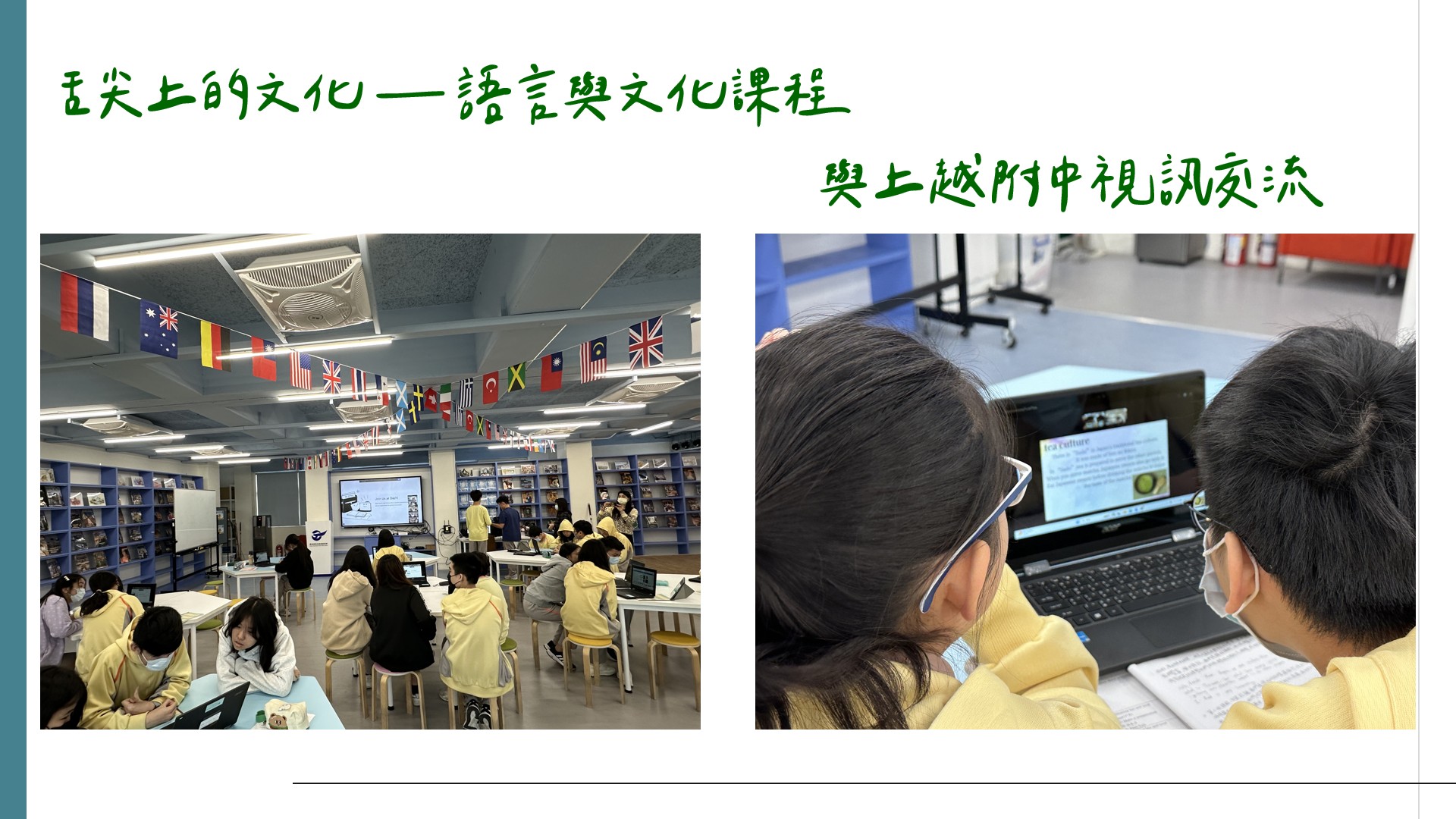 - 以本校總目標、國際教育面向及「國際教育議題實質內涵」指標為核心概念發展國際教育課程,於課程融入文化學習及SDGs等全球議題,使學生能夠關注國際議題,強化其身為世界公民的使命感,並落實於生活中。