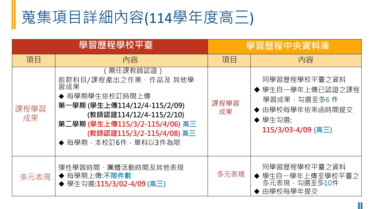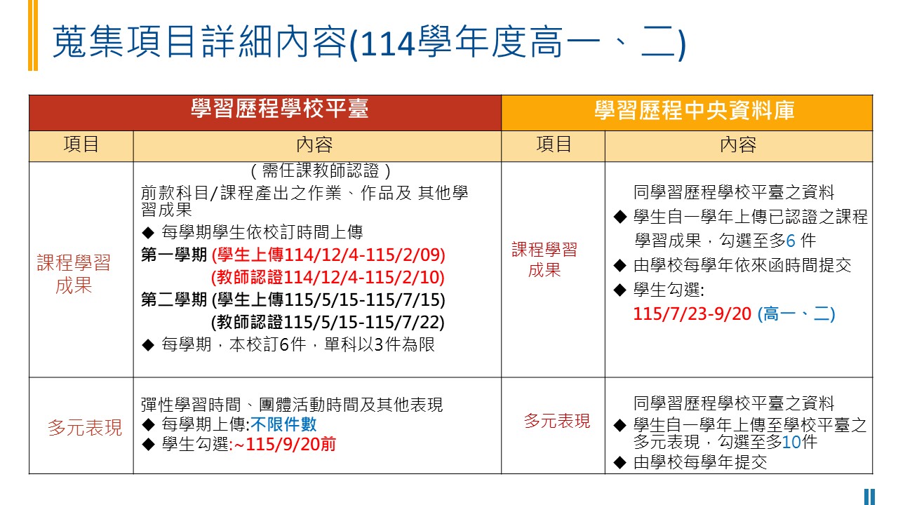 學習歷程檔案 – 重要期程 114學年度學習歷程檔案 期程與參考資料高一、二、高三(上) 課程學習成果 學生上傳 第一學期 114/12/4-115/2/9 17:00前 教師認證 114/12/5-115/2/10 學生勾選115/7/23-9/20 勾選件數至多6件 多元表現 學生上傳以學年度為主,上傳件數不限 學生勾選 115/3/2-4/9 (高三) 學生勾選 115/7/23-9/20 (高一、二) 勾選件數至多10件